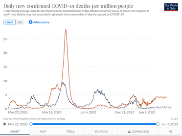 South Africa’s recent peak, which is now over with, was one-twentieth the size of Portugal’s – and this is after Portugal already had exponentially more cases from the previous wave. However, even as it relates to death rates, the afflicted country is outpacing South Africa.